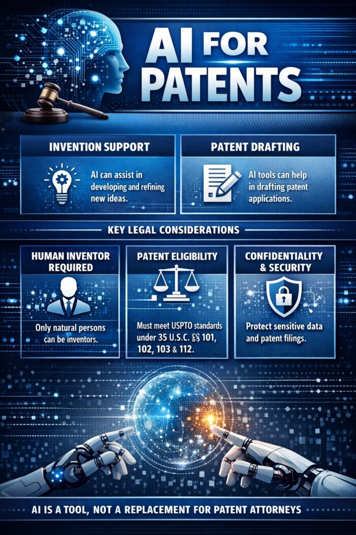 Inventors and patent practitioners will be using AI for patents more as the technology develops. AI can improve efficiency in invention development, prior art review, patent drafting, and patent prosecution. However, the law still requires human inventors, human responsibility, and human review. AI is not a replacement for inventors or patent attorneys. It is a tool that improves efficiency and reduces some of the tedious aspects of innovation and patent drafting.