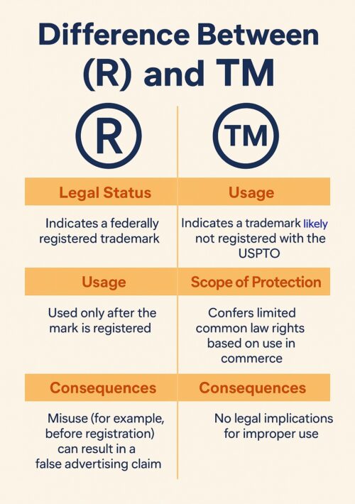 Trademarks are a form of intellectual property that identify a source of goods or services: names, logos, slogans, and other brand elements that distinguish a business’s goods or services. In the United States, business owners commonly use two symbols with their trademarks: TM (™) and ® (R in a circle). Understanding the difference between TM and R is important for anyone looking to safeguard their brand. The trademark symbols you use signal the legal status of your mark and carry important implications for trademark protection and enforcement. We explain here the meaning of these two symbols, when to use each, and the legal consequences of their use or misuse under U.S. law.