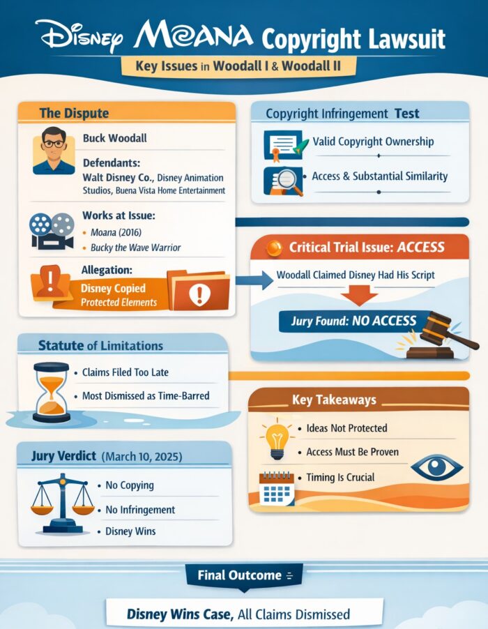 Applied to the Disney Moana copyright lawsuit, these cases meant that Woodall had to do more than identify shared high-level elements such as a Polynesian setting, a dangerous ocean voyage, an ordinary teen protagonist, ancestral spirits, or a tattooed demigod. Those features could support a narrative of similarity, but copyright infringement required evidence that Disney accessed Woodall’s work and copied protected expression rather than common ideas, cultural material, scènes à faire, coincidence, common sources, or independent creation.