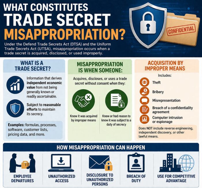 Trade secret misappropriation generally arises in two ways: (1) acquisition of a trade secret by improper means, or (2) disclosure or use of trade secrets without express or implied consent where the defendant knew or had reason to know that the information was acquired through improper means or under circumstances giving rise to a duty to maintain secrecy. This framework is codified in both federal law under the DTSA and under UTSA, which together form the backbone of modern trade secret law.