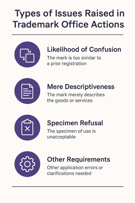 Trademark office actions are a common hurdle in the trademark registration process, but with a clear understanding of the issues and a prompt, thorough response, they can be overcome. By addressing the USPTO examining attorney’s concerns, you can often turn a initially refused application into a registered trademark. Always pay attention to the response deadlines, and ensure your response leaves no outstanding issue unaddressed.