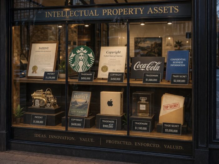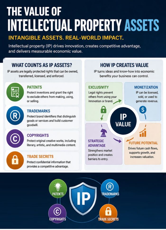 Intellectual property is legally protected, transferable, and capable of generating economic benefits and monetary value. Common forms of intellectual property rights include patents, trademarks, copyrights, and trade secrets, each of which can be owned, licensed, enforced, or incorporated into a company’s business model.