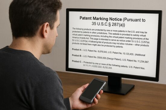 The U.S. marking statute, 35 U.S.C. § 287(a), now explicitly permits virtual marking. It states that a patentee may give notice that an article is patented “either by fixing thereon the word ‘patent’ or ‘pat.’ together with the number of the patent, or by fixing thereon the word ‘patent’ or ‘pat.’ together with an address of a posting on the Internet, accessible to the public without charge, that associates the patented article with the number of the patent”. In other words, you can either stamp the patent number on the product or simply mark the product with a web address where the patent numbers are listed. If marking the product itself is not possible, e.g., due to size or nature of the article, the statute allows marking the packaging in a similar way. The virtual patent marking notice on the product typically looks like: “Patent: www.YourCompany.com/patents” or some other format. As long as the referenced webpage clearly associates each product with its applicable patent numbers, this constitutes proper notice under the law.