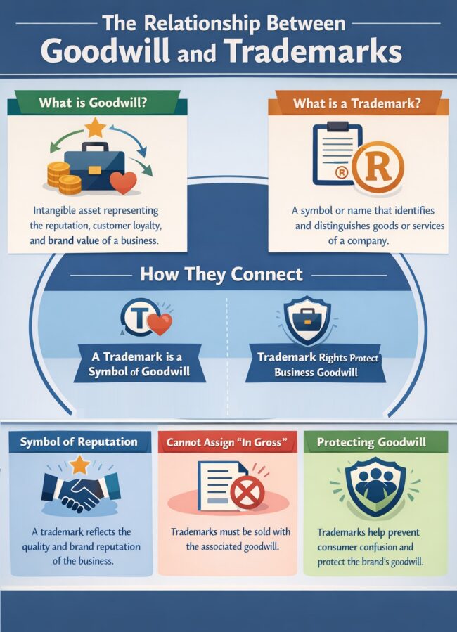 A trademark assignment divorced from goodwill is often called an assignment “in gross” and may be invalid. The rule exists because a trademark’s function is to identify a consistent commercial source and protect customer expectations. If a buyer acquires only the bare mark, without the customer relationships, brand reputation, product continuity, or business goodwill associated with that mark, consumers may be misled into believing the same business, quality, or source still stands behind the goods or services.